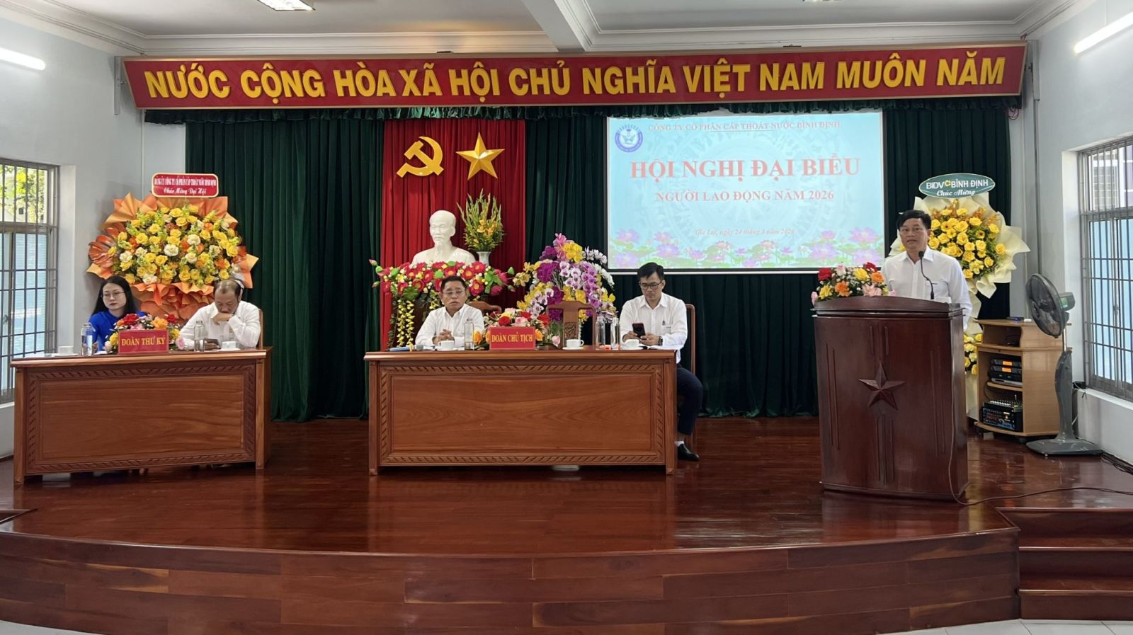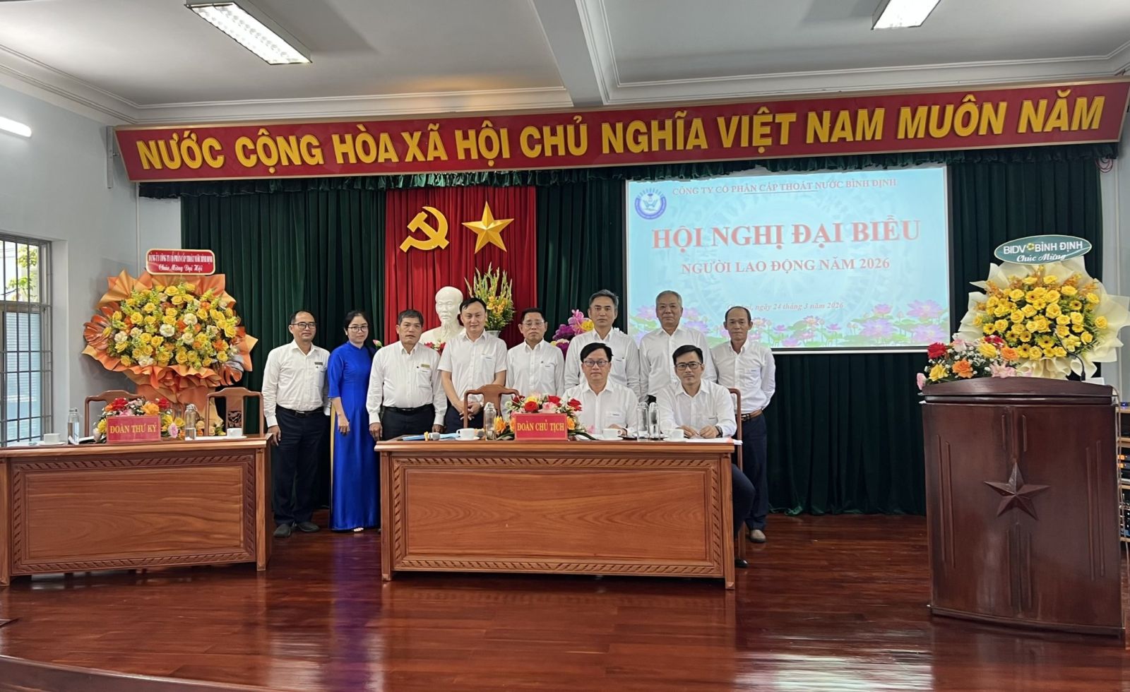 Hội nghị đại biểu Người lao động năm 2026 của Công ty cổ phần Cấp thoát nước Bình Định đã thành công tốt đẹp, thể hiện tinh thần dân chủ, đoàn kết và quyết tâm của tập thể người lao động trong việc hoàn thành các mục tiêu, nhiệm vụ năm 2026.