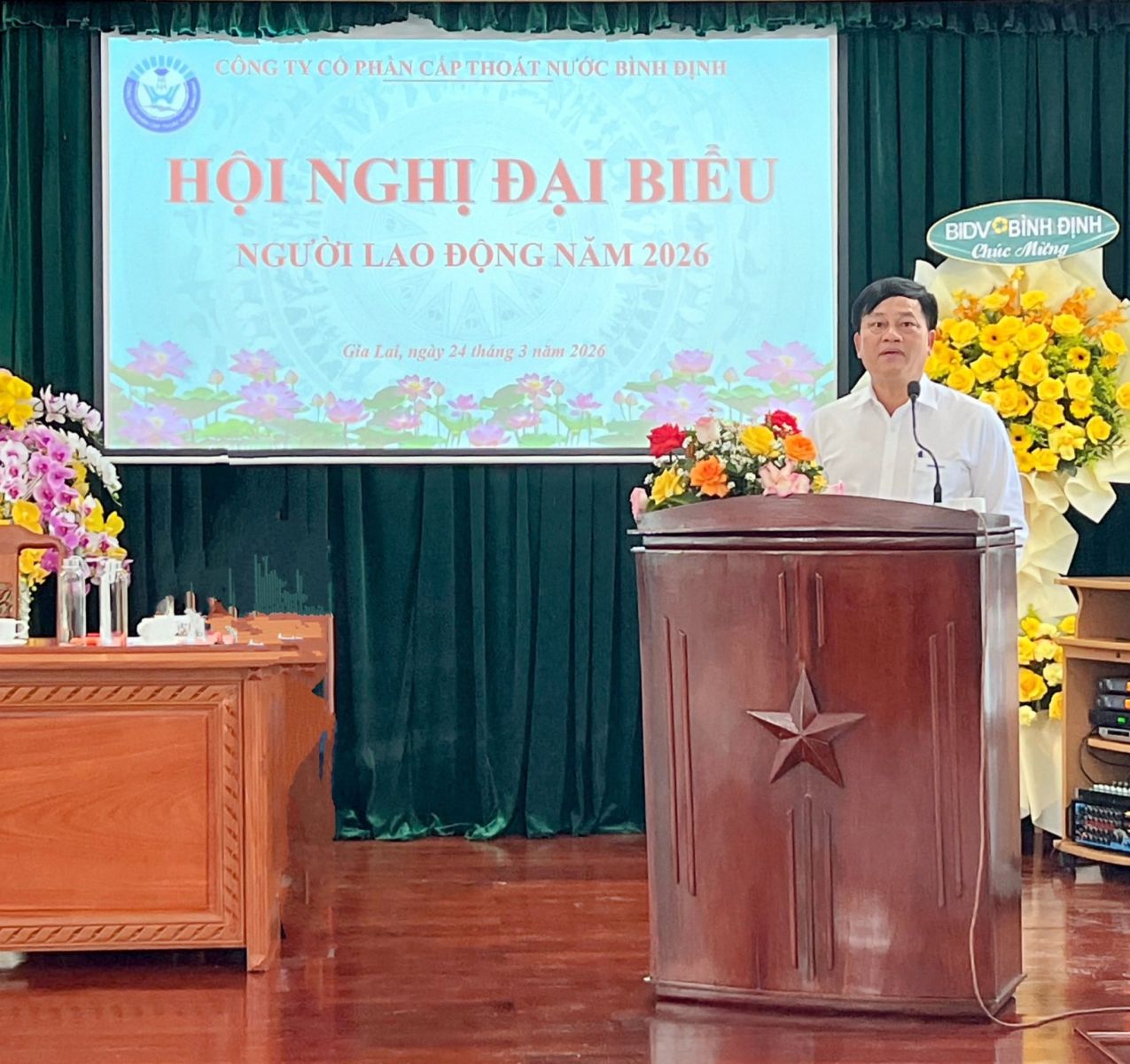 Chiều ngày 24/3/2026, tại hội trường Công ty cổ phần Cấp thoát nước Bình Định đã long trọng tổ chức Hội nghị đại biểu người lao động năm 2026. Hội nghị là diễn đàn quan trọng để người sử dụng lao động và người lao động cùng trao đổi, đánh giá kết quả thực hiện nhiệm vụ, đồng thời phát huy quyền dân chủ, góp phần xây dựng mối quan hệ lao động hài hòa, ổn định và tiến bộ trong Công ty.